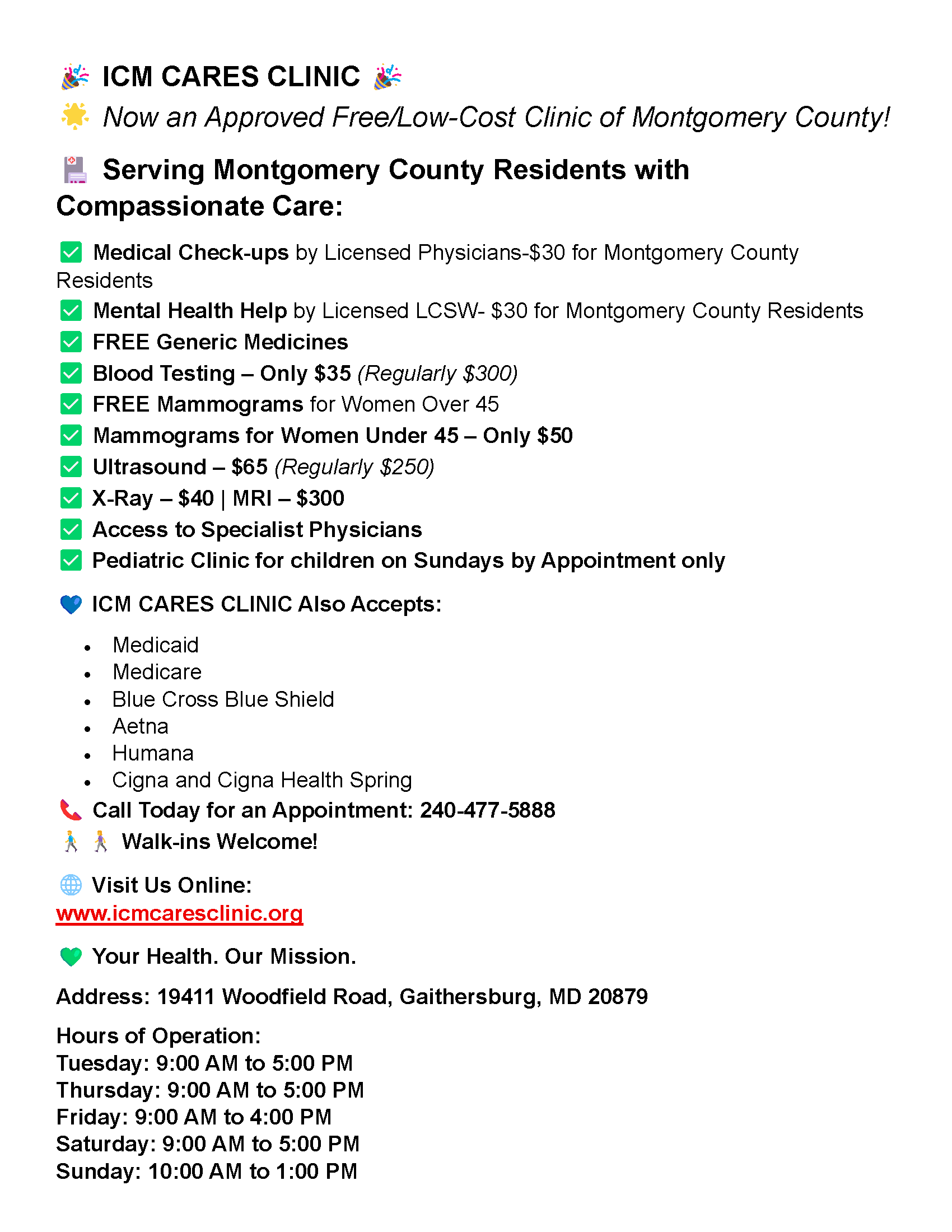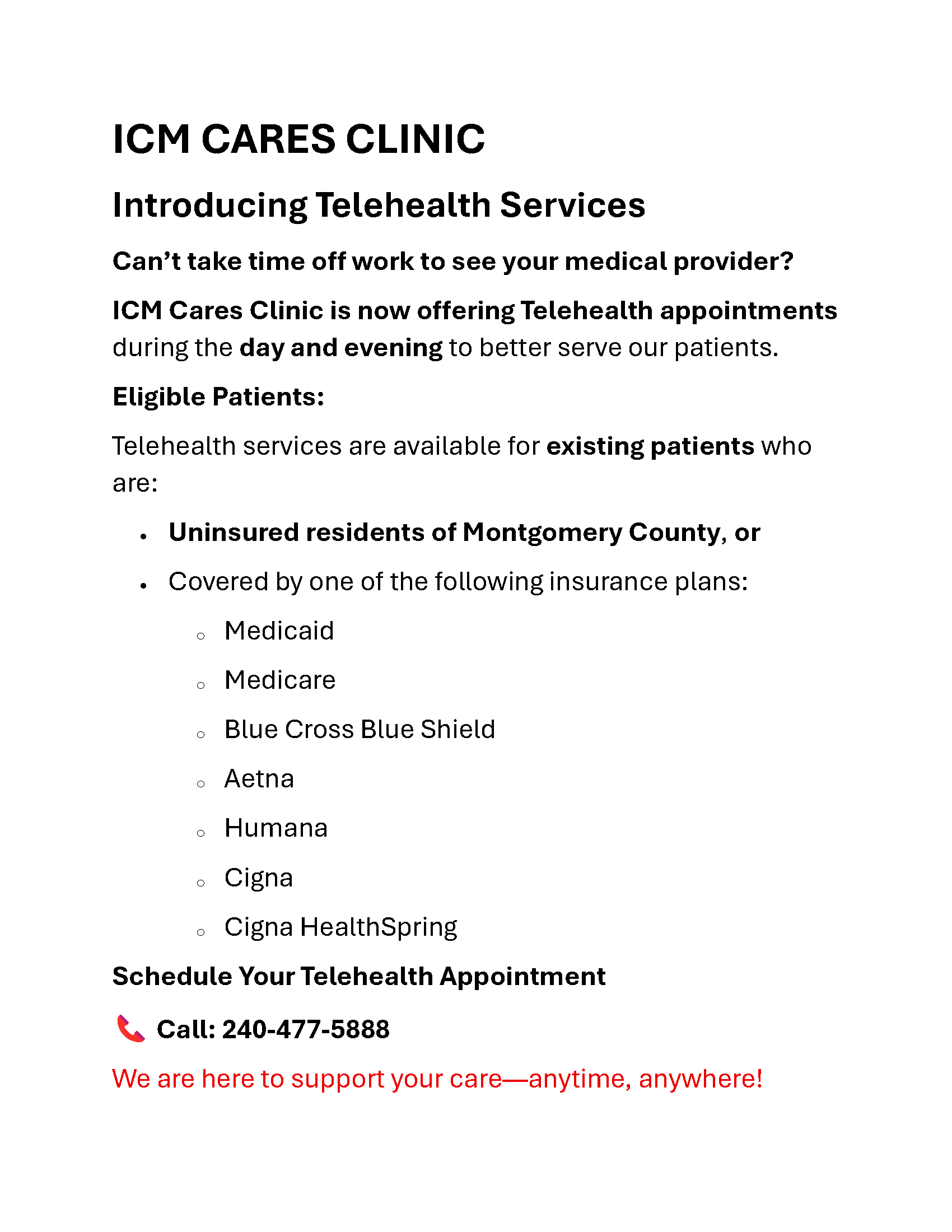 Privacy Policy: ICM Cares Clinic will never share, trade, or otherwise sell your personal information such as Phone numbers and SMS consent to third parties under any circumstances.